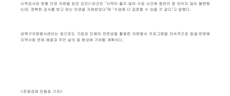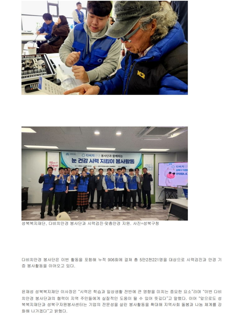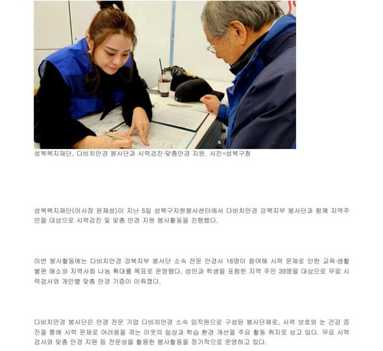 성북복지재단, 다비치안경 봉사단과 시력검진·맞춤안경 지원 등록일2026.02.11 조회수19 https://weekly.cnbnews.com/news/article.html?no=205343 (클릭) 이전글 이전 글이 없습니다. 다음글 성북복지재단, 지역사회 나눔 확산 잇따라…육상연맹·흥천사 기부금 전달 _ 문화일보 목록
