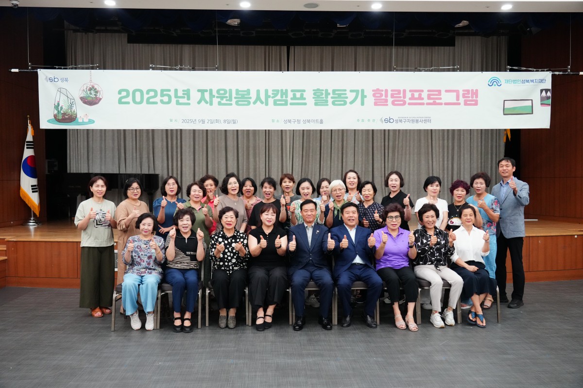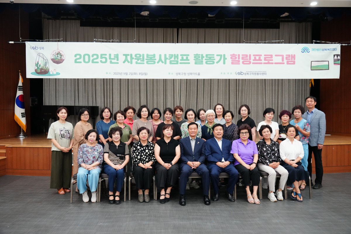 2025.9.8. 자원봉사캠프 활동가 힐링 프로그램 등록일2025.09.09 조회수19 이전글 2025. 9. 7. 성북구번영회 집수리봉사활동 다음글 2025.8.30. 성북 '안녕가족봉사단' 수료식 개최 목록